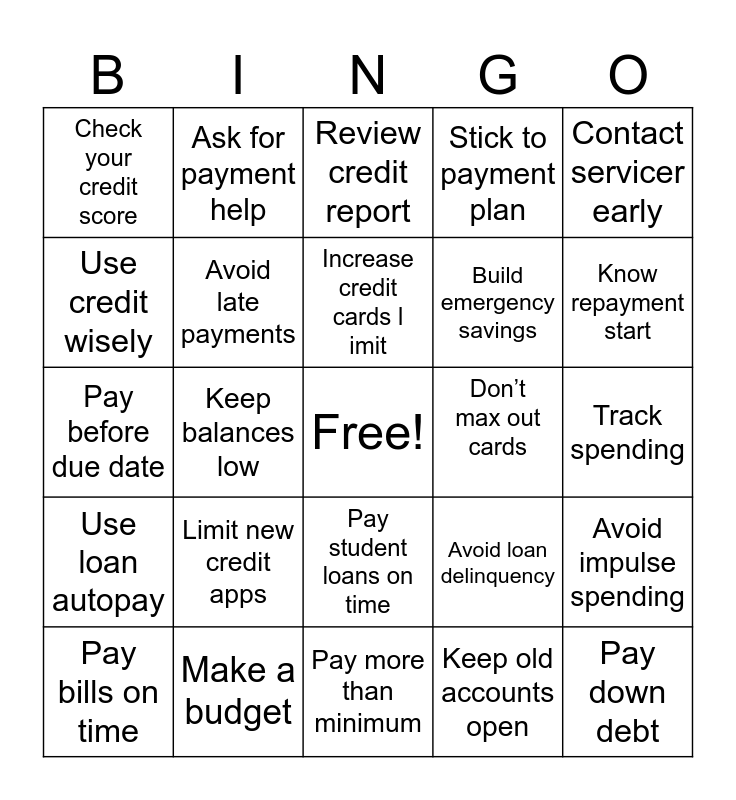This bingo card has a free space and 29 words: Pay bills on time, Set up autopay, Keep balances low, Use less than 30% of your credit limit, Check your credit score, Review credit report, Avoid late payments, Limit new credit apps, Don’t max out cards, Make a budget, Track spending, Pay down debt, Pay more than minimum, Keep old accounts open, Know repayment start, Check loan balance, Pay student loans on time, Use loan autopay, Contact servicer early, Pay before due date, Avoid loan delinquency, Ask about deferment, Build emergency savings, Use credit wisely, Stick to payment plan, Ask for payment help, Avoid impulse spending, Increase credit cards limit and Don’t open too many credit card accounts.