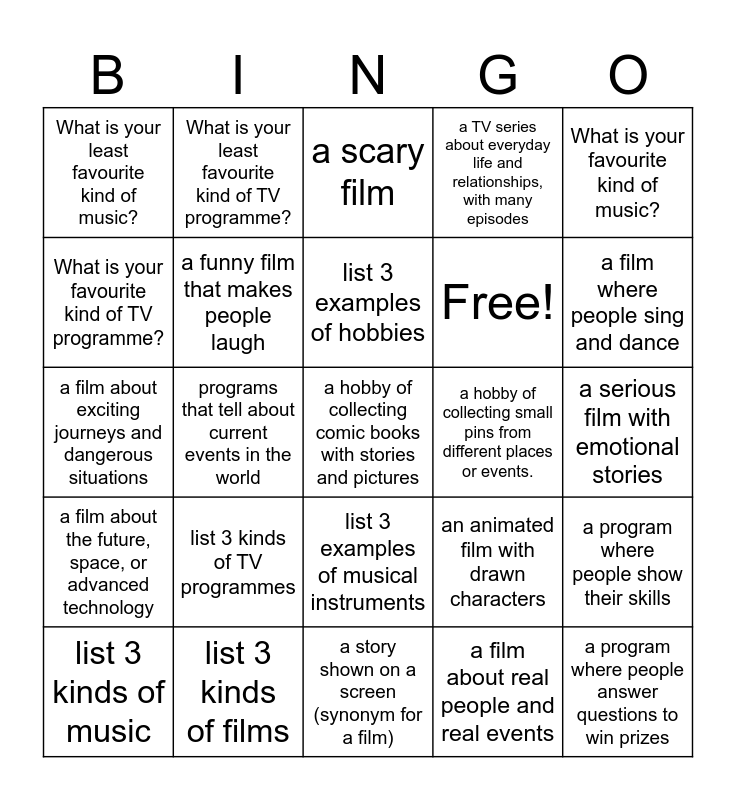 This bingo card has a free space and 24 words: list 3 kinds of TV programmes, list 3 kinds of films, list 3 examples of hobbies, list 3 kinds of music, What is your favourite kind of music?, What is your least favourite kind of music?, What is your favourite kind of TV programme?, What is your least favourite kind of TV programme?, a hobby of collecting small pins from different places or events., list 3 examples of musical instruments, Free!, a film about exciting journeys and dangerous situations, an animated film with drawn characters, a program where people show their skills, a funny film that makes people laugh, a film about real people and real events, a serious film with emotional stories, a scary film, a film where people sing and dance, programs that tell about current events in the world, a program where people answer questions to win prizes, a film about the future, space, or advanced technology, a TV series about everyday life and relationships, with many episodes and a story shown on a screen (synonym for a film).