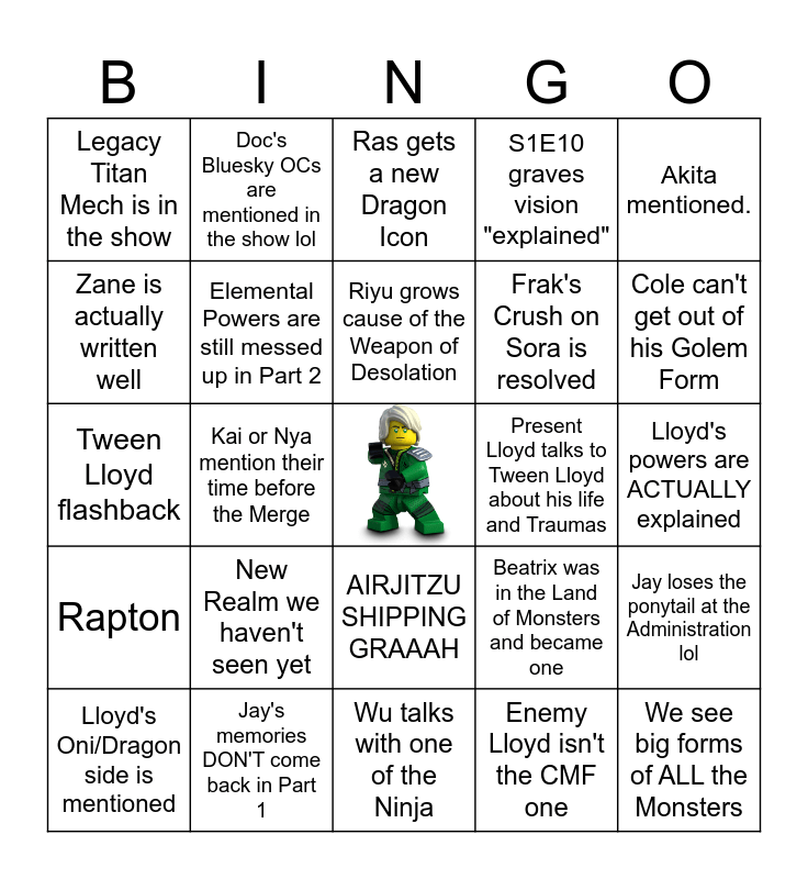 This bingo card has a free space and 24 words: New Realm we haven't seen yet, Jay's memories DON'T come back in Part 1, Riyu grows cause of the Weapon of Desolation, Lloyd's Oni/Dragon side is mentioned, Akita mentioned., Legacy Titan Mech is in the show, Zane is actually written well, Doc's Bluesky OCs are mentioned in the show lol, Present Lloyd talks to Tween Lloyd about his life and Traumas, AIRJITZU SHIPPING GRAAAH, Frak's Crush on Sora is resolved, Tween Lloyd flashback, Beatrix was in the Land of Monsters and became one, Jay loses the ponytail at the Administration lol, Elemental Powers are still messed up in Part 2, Enemy Lloyd isn't the CMF one, Lloyd's powers are ACTUALLY explained, Ras gets a new Dragon Icon, Cole can't get out of his Golem Form, Kai or Nya mention their time before the Merge, We see big forms of ALL the Monsters, Rapton, S1E10 graves vision "explained" and Wu talks with one of the Ninja.