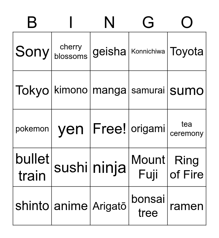 This bingo card has a free space and 24 words: sushi, anime, manga, shinto, Toyota, Sony, Tokyo, cherry blossoms, origami, ninja, samurai, pokemon, Mount Fuji, Ring of Fire, kimono, bonsai tree, tea ceremony, geisha, sumo, yen, ramen, bullet train, Konnichiwa and Arigatō.