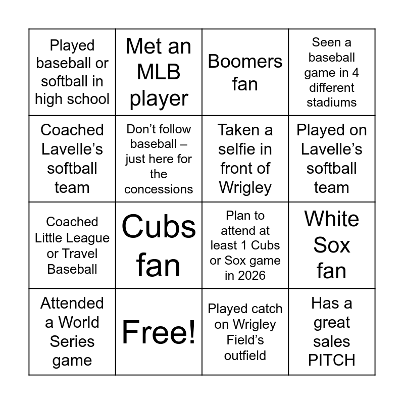 This bingo card has 16 words: Free!, White Sox fan, Boomers fan, Played baseball or softball in high school, Coached Little League or Travel Baseball, Met an MLB player, Plan to attend at least 1 Cubs or Sox game in 2026, Played catch on Wrigley Field’s outfield, Coached Lavelle’s softball team, Don’t follow baseball – just here for the concessions, Attended a World Series game, Seen a baseball game in 4 different stadiums, Cubs fan, Played on Lavelle’s softball team, Taken a selfie in front of Wrigley and Has a great sales PITCH.