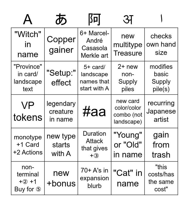 This bingo card has a free space and 24 words: new type starts with A, new +bonus, 5+ card/ landscape names that start with A, non-terminal +② +1 Buy for ⑤, checks own hand size, "Witch" in name, "Province" in card/ landscape text, Copper gainer, new card color/color combo (not landscape), Duration Attack that gives +③, 2+ new non-Supply piles, VP tokens, "Young" or "Old" in name, gain from trash, "Setup:" effect, "Cat" in name, recurring Japanese artist, 6+ Marcel-André Casasola Merkle art, modifies basic Supply pile(s), legendary creature in name, "this costs/has the same cost", monotype +1 Card +2 Actions, new multitype Treasure and 70+ A's in expansion blurb.