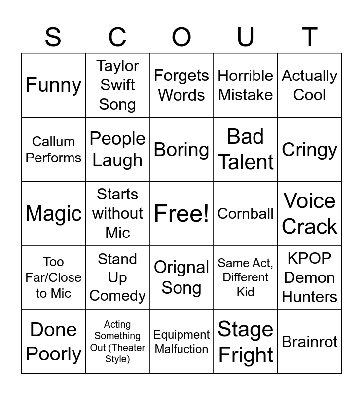 This bingo card has a free space and 24 words: Stand Up Comedy, Acting Something Out (Theater Style), Boring, Done Poorly, Actually Cool, Funny, Callum Performs, Taylor Swift Song, Cornball, Orignal Song, Bad Talent, Magic, Same Act, Different Kid, KPOP Demon Hunters, People Laugh, Stage Fright, Voice Crack, Forgets Words, Cringy, Starts without Mic, Brainrot, Too Far/Close to Mic, Horrible Mistake and Equipment Malfuction.