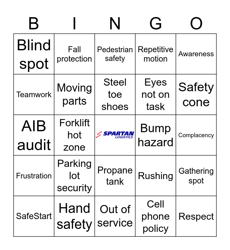 This bingo card has a free space and 35 words: Electrical safety, Emergency exit, Mind not on task, Moving parts, Propane tank, Repetitive motion, Teamwork, Trailer stand, Steel toe shoes, Visitor policy, AIB audit, Awareness, Leaning items, No stage zone, Blind spot, Bump hazard, Cell phone policy, Forklift hot zone, Frustration, Respect, Rushing, SafeStart, Gathering spot, Hand safety, Pedestrian safety, Safety cone, Spill kit, Eye for safety, Eyes not on task, Complacency, Distracted driving, Out of service, Parking lot security, Fall protection and Hazard identification.