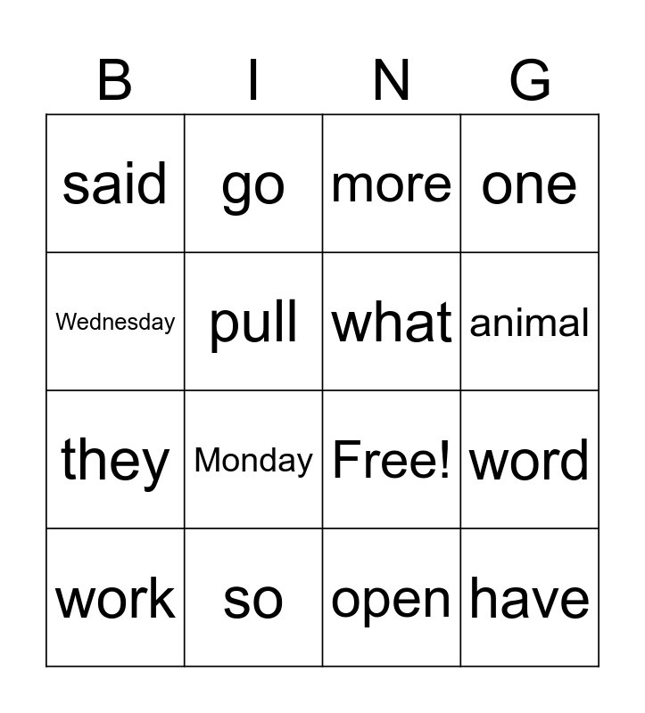 This bingo card has 22 words: so, no, go, put, pull, what, said, more, Free!, have, they, one, two, only, open, over, word, work, Monday, Wednesday, animal and buy.