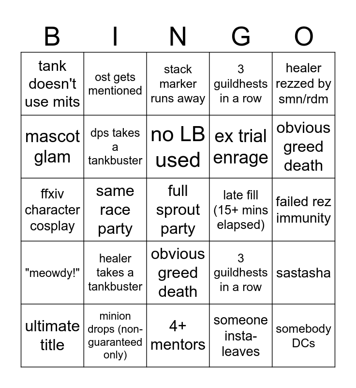 ⚠ This card has duplicate items: all DMV portraits (2), non-ARR extreme trial (2), MSQ Roulette duty (2), 2 full wipes in a non-ex duty (2), tanks fight for aggro (2), 3 guildhests in a row (2), mentor leaves first (2), crystal tower raid (2), toxic mentor (2), healer lb3 used (2), same duty twice in a row (2), 1 pull clear ex trial (2), lvl 30+ without job stone (2), bockman (2), last man standing (2), 4+ mentors (2), vote abandon passes (2), expert roulette dungeon (2), arcadion raid (2), nsfw portrait (2), minion drops (non-guaranteed only) (2), sastasha (2), non-MSQ duty (2), guildhest wipe (2), same race party (2), ost gets mentioned (2), 4-man trial (2), mascot glam (2), healer is top dps (2), empty gear slot (2), broken gear (2), in the blender (2), failed rez immunity (2), light party moment (2), phoenix down moment (2), knockback immunity fail (2), fell off arena (2), ex trial enrage (2), dps takes a tankbuster (2), healer takes a tankbuster (2), nier raid (2), obvious greed death (2), "i don't remember this" (2), full sprout party (2), healer rezzed by smn/rdm (2), legend title dies first (2), ffxiv character cosplay (2), /playdead at the start (2), vote dismiss passes (2), no LB used (2), ultimate weapon glam (2), ultimate title (2), rez macro (2), party wipe (2), rare duty pull (2), forgor stance (tank, kardia, dp) (2), burger king moment (2), hard mode dungeon (2), tank lb3 used (2), stack marker runs away (2), somebody DCs (2), someone insta-leaves (2), party cleaved (2), YPYT (2), late fill (15+ mins elapsed) (2), "meowdy!" (2), multi-line emoji macro (2), dungeon takes 20+ minutes (2), eat prae love (2), single pull tank (2), 3+ vuln stacks / DDs (2), tank doesn't use mits (2), soft enrage wipe (2)