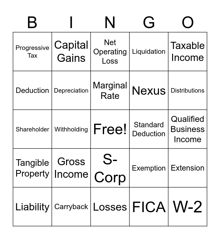 This bingo card has a free space and 53 words: Audit, W-2, W-4, FICA, Gross Income, Bracket, Capital Gains, Credit, Deduction, Dependant, Depreciation, Dividend, Extension, Exemption, Itemized, Liability, Marginal Rate, Standard Deduction, Refund, Taxable Income, Withholding, 1040, Nexus, Progressive Tax, Capitalization, Carryback, Carryover, Compliance, Cost of Goods Sold, Distributions, Double Taxation, Estimated Tax, Excise Tax, Franchise Tax, Gross Receipts, Inventory, Liquidation, Losses, Net Operating Loss, Pass-through, Payroll Tax, Profit, Qualified Business Income, Recapture, Retained Earnings, S-Corp, Sales Tax, Self-Employment Tax, Shareholder, Tangible Property, Treasury Regulation, Unitary and Valuation.