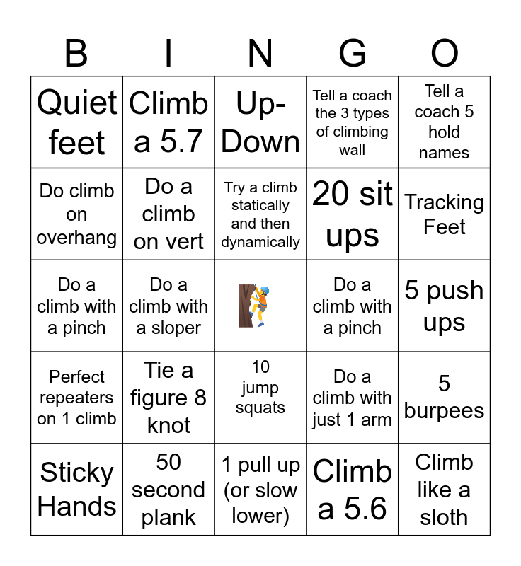 This bingo card has a free space and 24 words: Tie a figure 8 knot, 50 second plank, Try a climb statically and then dynamically, Sticky Hands, Tell a coach 5 hold names, Quiet feet, Do climb on overhang, Climb a 5.7, Do a climb with a pinch, 10 jump squats, 20 sit ups, Do a climb with a pinch, Do a climb with just 1 arm, 5 burpees, Do a climb on vert, Climb a 5.6, 5 push ups, Up-Down, Tracking Feet, Do a climb with a sloper, Climb like a sloth, Perfect repeaters on 1 climb, Tell a coach the 3 types of climbing wall and 1 pull up (or slow lower).