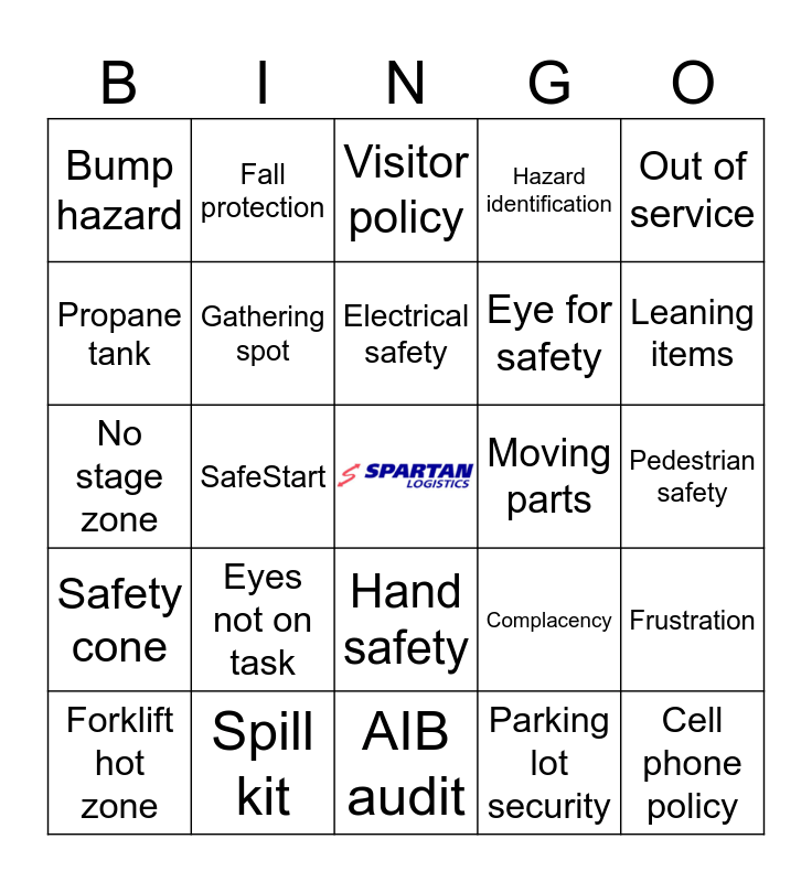 This bingo card has a free space and 35 words: Steel toe shoes, Teamwork, Trailer stand, Gathering spot, Hand safety, Hazard identification, Propane tank, Repetitive motion, Electrical safety, Emergency exit, No stage zone, Out of service, Awareness, Blind spot, Bump hazard, Moving parts, Parking lot security, SafeStart, Safety cone, Cell phone policy, Complacency, Forklift hot zone, Frustration, Spill kit, Visitor policy, Leaning items, Mind not on task, Distracted driving, Eye for safety, Pedestrian safety, Respect, AIB audit, Eyes not on task, Fall protection and Rushing.