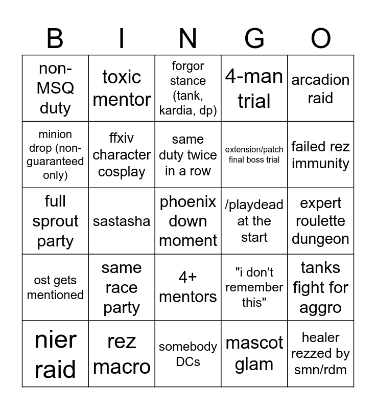 This bingo card has 67 words: all DMV portraits, MSQ Roulette duty, 2 full wipes in a non-ex duty, tanks fight for aggro, mentor leaves first, crystal tower raid, toxic mentor, healer lb3 used, same duty twice in a row, last man standing, 4+ mentors, vote abandon passes, expert roulette dungeon, arcadion raid, nsfw portrait, minion drop (non-guaranteed only), sastasha, non-MSQ duty, guildhest wipe, extension/patch final boss trial, same race party, ost gets mentioned, 4-man trial, mascot glam, healer is top dps, empty gear slot, broken gear, in the blender, failed rez immunity, light party moment, phoenix down moment, knockback immunity fail, fell off arena, dps takes a tankbuster, healer takes a tankbuster, nier raid, obvious greed death, "i don't remember this", full sprout party, healer rezzed by smn/rdm, legend title dies first, ffxiv character cosplay, /playdead at the start, vote dismiss passes, no LB used, ultimate weapon glam, ultimate title, rez macro, party wipe, rare duty pull, forgor stance (tank, kardia, dp), burger king moment, hard mode dungeon, tank lb3 used, stack marker runs away, somebody DCs, someone insta-leaves, party cleaved, YPYT, "meowdy!", multi-line emoji macro, dungeon takes 20+ minutes, eat prae love, single pull tank, 3+ vuln stacks / DDs, tank doesn't use mits and soft enrage wipe.