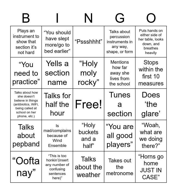 This bingo card has a free space and 39 words: “One more time!”, Yells at Grayson, Talks about clarinets in a positive way, Yells a section name, “Oofta nay”, “Holy buckets and a half”, “Holy moly rocky”, “Oh my Heavens to Betsie”, Puts hands on either side of her table, looks down, and breathes heavily, Talks about pepband, Talks for half the hour, Talks about percussion instruments in any way, shape, or form, “Horns go home JUST IN CASE”, Does ‘the glare’, Tunes a section, Is mad/complains because of Wind Ensemble, “I’m not a trumpet player so….”, Plays an instrument to show that section it’s not hard, “I don’t see anything difficult with this”, “You are all good players”, “You need to practice”, Talks about the weather, Mentions how far away she lives from the school, Stops within the first 10 measures, Taps her baton on her table, Talks about how overwhelmed she is, “Posture!”, Gets distracted right after getting ready to start a song, “Who has a lesson?”, “You should have slept more/go to bed earlier”, “I’m excitable today’, “Wake up and smell the coffee”, “Pssshhht”, “This is too honkin’(insert any number of confusing sentences here)”, Takes out the metronome, Loses something, “Woah, what are we doing there?”, Talks about how she doesn’t believe in things (antibiotics, WiFi, being called at school on her phone, etc.) and "Make good choices.