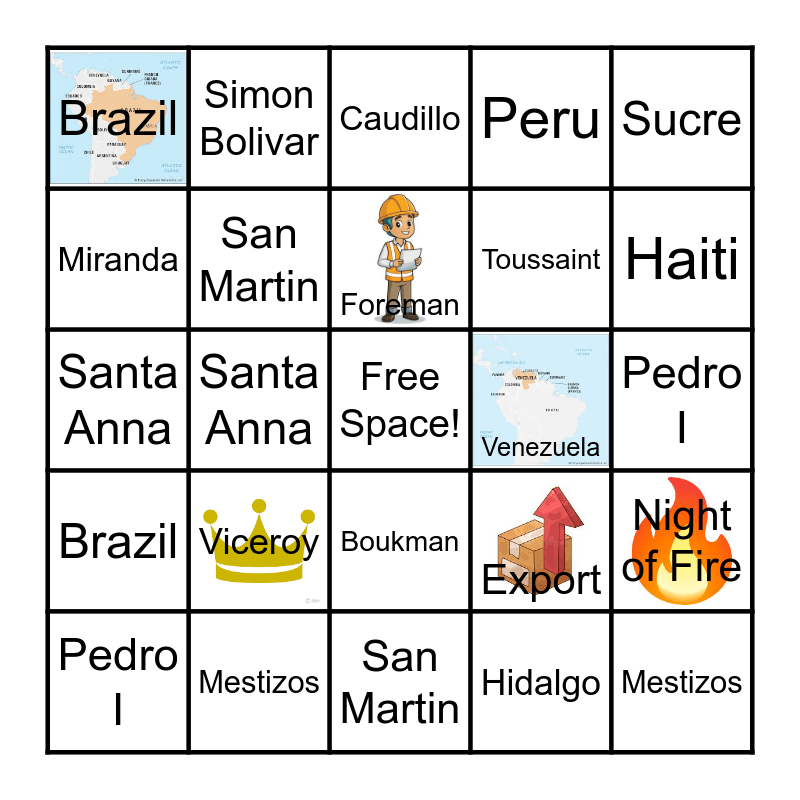 This bingo card has 13 images, a free space and 53 words: Hacienda, Mestizos, Argentina, Hidalgo, Viceroy, Haiti, Simon Bolivar, 1810, Miranda, Yellow Fever, San Martin, Peru, Night of Fire, Export, Bolivia, Pedro I, Foreman, Venezuela, Boukman, Sucre, Santa Anna, Guerrillas, Toussaint, Brazil, Hacienda, Mestizos, Argentina, Hidalgo, Creole, Haiti, Night of Fire, Bolivar, 1810, Miranda, Yellow Fever, Free Space, Peru, San Martin, Caudillo, Liberator, Bolivia, Mexico, Pedro I, Foreman, Venezuela, Boukman, Sucre, Iturbide, Santa Anna, Brazil, Toussaint, Indigenous and Guerrillas.