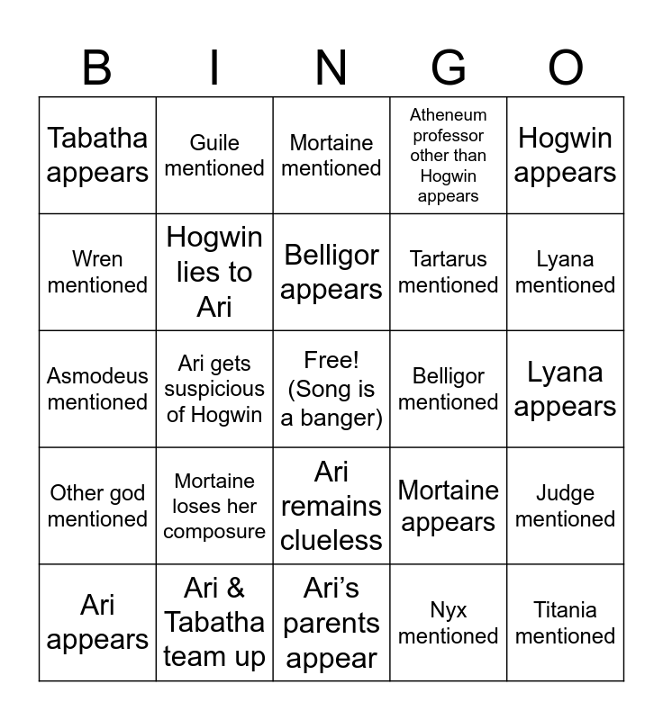 This bingo card has a free space and 24 words: Mortaine loses her composure, Ari & Tabatha team up, Belligor appears, Ari appears, Hogwin appears, Tabatha appears, Wren mentioned, Guile mentioned, Belligor mentioned, Ari remains clueless, Tartarus mentioned, Asmodeus mentioned, Mortaine appears, Judge mentioned, Hogwin lies to Ari, Nyx mentioned, Lyana appears, Mortaine mentioned, Lyana mentioned, Ari gets suspicious of Hogwin, Titania mentioned, Other god mentioned, Atheneum professor other than Hogwin appears and Ari’s parents appear.