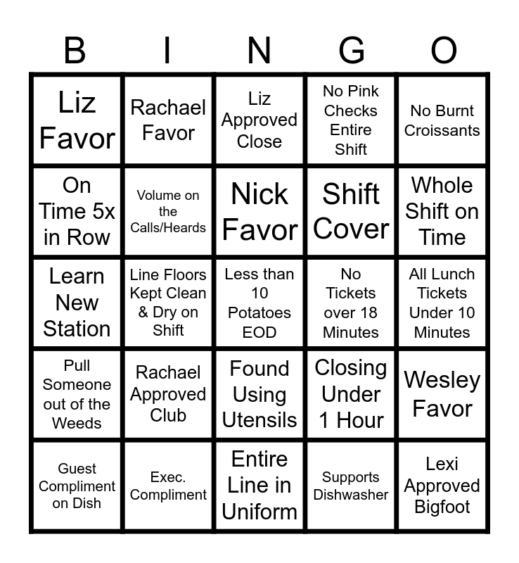 This bingo card has 25 words: Rachael Approved Club, Entire Line in Uniform, Nick Favor, Guest Compliment on Dish, No Burnt Croissants, Liz Favor, On Time 5x in Row, Rachael Favor, No Tickets over 18 Minutes, Found Using Utensils, Shift Cover, Learn New Station, Closing Under 1 Hour, Wesley Favor, Volume on the Calls/Heards, Lexi Approved Bigfoot, All Lunch Tickets Under 10 Minutes, Liz Approved Close, Whole Shift on Time, Line Floors Kept Clean & Dry on Shift, Less than 10 Potatoes EOD, Exec. Compliment, Pull Someone out of the Weeds, No Pink Checks Entire Shift and Supports Dishwasher.