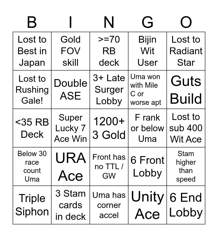 This bingo card has a free space and 24 words: URA Ace, 3 Stam cards in deck, 3+ Late Surger Lobby, Triple Siphon, Lost to Radiant Star, Lost to Best in Japan, Lost to Rushing Gale!, Gold FOV skill, F rank or below Uma, Front has no TTL / GW, Uma won with Mile C or worse apt, <35 RB Deck, 6 Front Lobby, Stam higher than speed, Double ASE, Unity Ace, Lost to sub 400 Wit Ace, >=70 RB deck, Guts Build, Super Lucky 7 Ace Win, 6 End Lobby, Below 30 race count Uma, Bijin Wit User and Uma has corner accel.