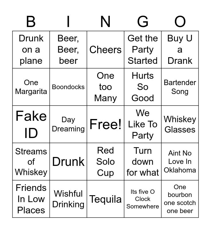 This bingo card has a free space and 44 words: Shots, One bourbon one scotch one beer, Margaritaville, Friends In Low Places, Fireball, Its five O Clock Somewhere, Cheers, Tik tok, Buy U a Drank, Wishful Drinking, Get the Party Started, We Like To Party, Red Solo Cup, Drunk, Domino, Tequila, Escape, Fake ID, Raise Your Glass, Bartender Song, Beer, Beer, beer, Ten Round with Jose Cuervo, I love This Bar, Drunk on a plane, You Proof, Whiskey Glasses, Tennessee Whiskey, Die Young, Turn down for what, Streams of Whiskey, House party, Aint No Love In Oklahoma, Alcohol, Hole in the bottle, Day Dreaming, I Like It I love it, Malibu, Jack & Dane, One too Many, One Margarita, Hurts So Good, 1,2 many, Boondocks and A Bar Song.