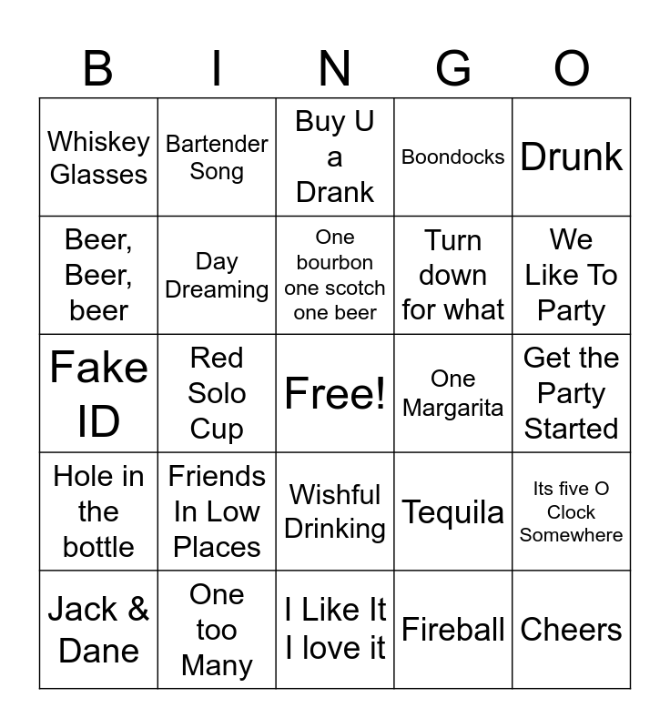 This bingo card has a free space and 42 words: Shots, One bourbon one scotch one beer, Margaritaville, Friends In Low Places, Fireball, Its five O Clock Somewhere, Cheers, Tik tok, Buy U a Drank, Wishful Drinking, Get the Party Started, We Like To Party, Red Solo Cup, Drunk, Domino, Tequila, Escape, Fake ID, Raise Your Glass, Bartender Song, Beer, Beer, beer, Ten Round with Jose Cuervo, I love This Bar, Whiskey Glasses, Tennessee Whiskey, Die Young, Turn down for what, Streams of Whiskey, House party, Aint No Love In Oklahoma, Alcohol, Hole in the bottle, Day Dreaming, I Like It I love it, Malibu, Jack & Dane, One too Many, One Margarita, Hurts So Good, 1,2 many, Boondocks and A Bar Song.