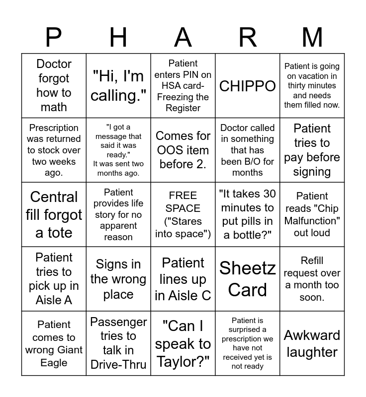 This bingo card has a free space and 49 words: "I got a message that said it was ready. I deleted it.", Awkward laughter, Patient repeats the entire DOB when asked for just part of it., "Can I speak to Taylor?", Signs in the wrong place, Doesn't hit Done, "Hi, I'm calling.", Patient wants to forge a signature., Prescription was returned to stock over two weeks ago., "I got a message that said it was ready." It doesn't say that., "I got a message that said it was ready." It was sent two months ago., CHIPPO, Refill request over a month too soon., Sheetz Card, once, Comes for CF item before 12., Comes for OOS item before 2., "It takes 30 minutes to put pills in a bottle?", Only signs once even though you explained what both signatures are for., Patient is going on vacation in thirty minutes and needs them filled now., Patient provides life story for no apparent reason, Patient is surprised a prescription we have not received yet is not ready, Doctor forgot how to math, Doctor called in something that has been B/O for months, Patient uses wrong stylus/finger to sign., Patient tries to pay before signing, Patient comes to wrong Giant Eagle, Credit card inserted before transaction is started, Patient lines up in Aisle C, Patient tries to pick up in Aisle A, On Phone In Drive-Thru, Patient thinks only their last name is sufficient identification, Patient misgenders Peri despite obvious signs, Patient can't figure out how to go to the register to pick up, Passenger tries to talk in Drive-Thru, Patient won't stop talking while you're trying to do something for them, Patient just lies, Patient wanders off after filling out shot form, Patient reads "Chip Malfunction" out loud, Patient swipes card after you specifically tell them not to, Patient uses "I don't come here often" as an excuse for failing to follow basic instructions, Patient asks if something is ready immediately after being told that it is ready, Patient reveals Advantage Card after paying, Forgets family member's birthday, Central fill forgot a tote, Patient enters PIN on HSA card- Freezing the Register, "I just left the Doctor's Office 20 Minutes ago" Surprised it's not ready., Doctor sends absolute nonsense and 6+ cars in Drive-Thru.