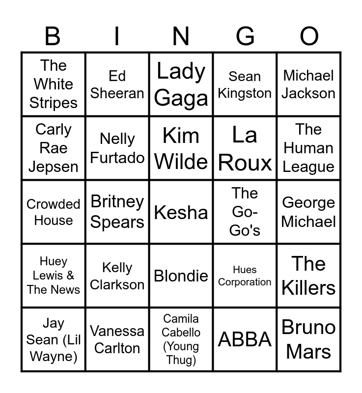 This bingo card has a free space and 44 words: Sia, Bruno Mars, The Weeknd, Jay Sean (Lil Wayne), Billy Joel, ABBA, Lady Gaga, Smash Mouth, Michael Jackson, Vanessa Carlton, Sean Kingston, The Go-Go's, Blondie, Kelly Clarkson, Cutting Crew, Camila Cabello (Young Thug), Cheryl Lynn, Crowded House, Beyoncé (Jay-Z), The Human League, Ed Sheeran, The Bangles, MAGIC!, The White Stripes, Journey, George Michael, Kylie Minogue, Harry Styles, Hues Corporation, Huey Lewis & The News, Belinda Carlisle, The Killers, The Mamas & The Papas, Capital Cities, Britney Spears, Soulja Boy, Jason Derulo, INXS, Kim Wilde, Carly Rae Jepsen, La Roux, Avril Lavigne, Nelly Furtado and Rihanna.