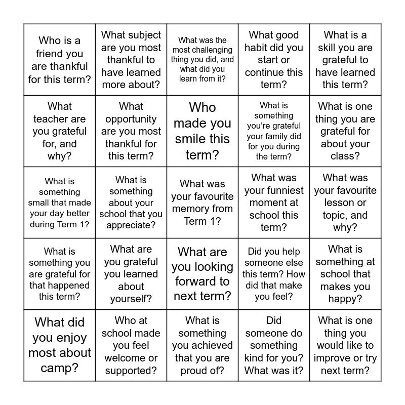 This bingo card has 25 words: What is something you are grateful for that happened this term?, Who at school made you feel welcome or supported?, What was your favourite memory from Term 1?, Did someone do something kind for you? What was it?, What is a skill you are grateful to have learned this term?, Who is a friend you are thankful for this term?, What subject are you most thankful to have learned more about?, What was the most challenging thing you did, and what did you learn from it?, What was your funniest moment at school this term?, What is something at school that makes you happy?, What teacher are you grateful for, and why?, What opportunity are you most thankful for this term?, What is something you achieved that you are proud of?, Did you help someone else this term? How did that make you feel?, What is one thing you are grateful for about your class?, What did you enjoy most about camp?, What is something about your school that you appreciate?, Who made you smile this term?, What is something you’re grateful your family did for you during the term?, What was your favourite lesson or topic, and why?, What is something small that made your day better during Term 1?, What are you grateful you learned about yourself?, What are you looking forward to next term?, What good habit did you start or continue this term? and What is one thing you would like to improve or try next term?.