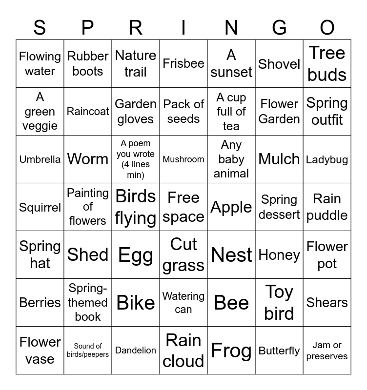 This bingo card has a free space and 48 words: Bee, Flower Garden, Rain cloud, Painting of flowers, A poem you wrote (4 lines min), Rain puddle, Rubber boots, Sound of birds/peepers, Shovel, Cut grass, Tree buds, Frisbee, Mulch, Any baby animal, Berries, Spring dessert, A green veggie, Spring outfit, Toy bird, A sunset, A cup full of tea, Birds flying, Flowing water, Raincoat, Shears, Garden gloves, Ladybug, Flower vase, Mushroom, Worm, Butterfly, Apple, Flower pot, Spring-themed book, Squirrel, Nest, Honey, Umbrella, Egg, Bike, Spring hat, Jam or preserves, Nature trail, Dandelion, Pack of seeds, Watering can, Shed and Frog.