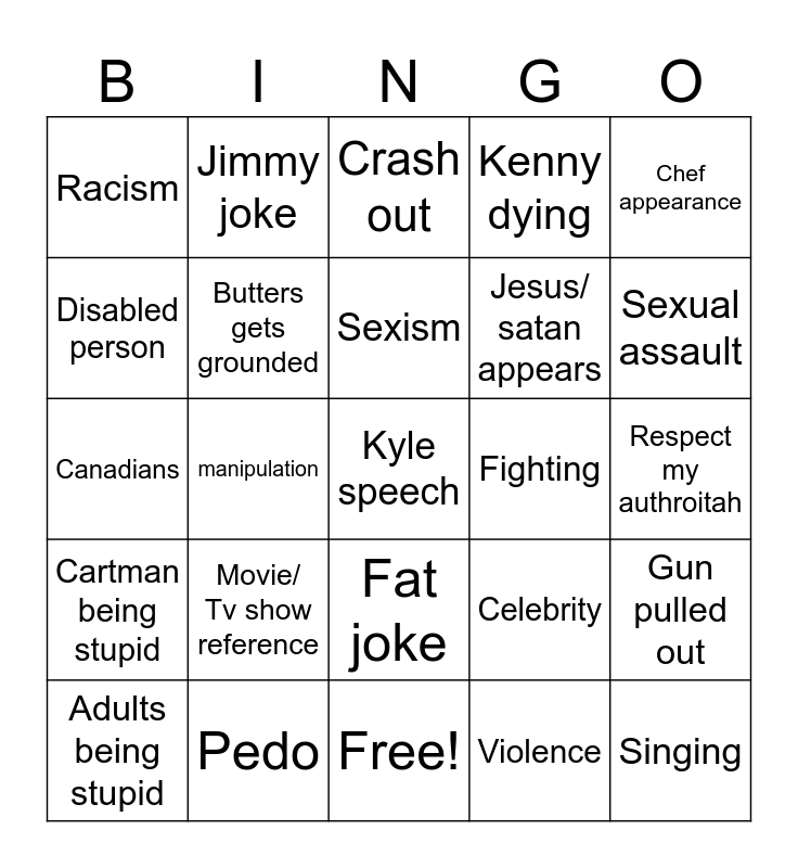 This bingo card has 29 words: Adults being stupid, jew joke, manipulation, Singing, Racism, Crash out, Butters gets grounded, Movie/ Tv show reference, Fighting, Pedo, Respect my authroitah, Kyle speech, Free!, Violence, Sexual assault, they took er jerbs, Fat joke, Cartman being stupid, Chef appearance, Canadians, Celebrity, Tfbw/Sot, Jesus/ satan appears, Disabled person, Kenny dying, Jimmy joke, Gun pulled out, Sexism and Homophobia.