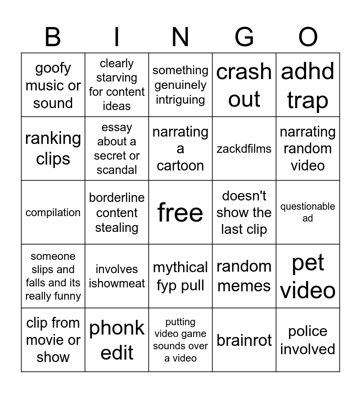 This bingo card has a free space and 24 words: involves ishowmeat, phonk edit, narrating a cartoon, clip from movie or show, adhd trap, goofy music or sound, ranking clips, clearly starving for content ideas, doesn't show the last clip, mythical fyp pull, zackdfilms, compilation, random memes, pet video, essay about a secret or scandal, brainrot, questionable ad, something genuinely intriguing, narrating random video, borderline content stealing, police involved, someone slips and falls and its really funny, crash out and putting video game sounds over a video.