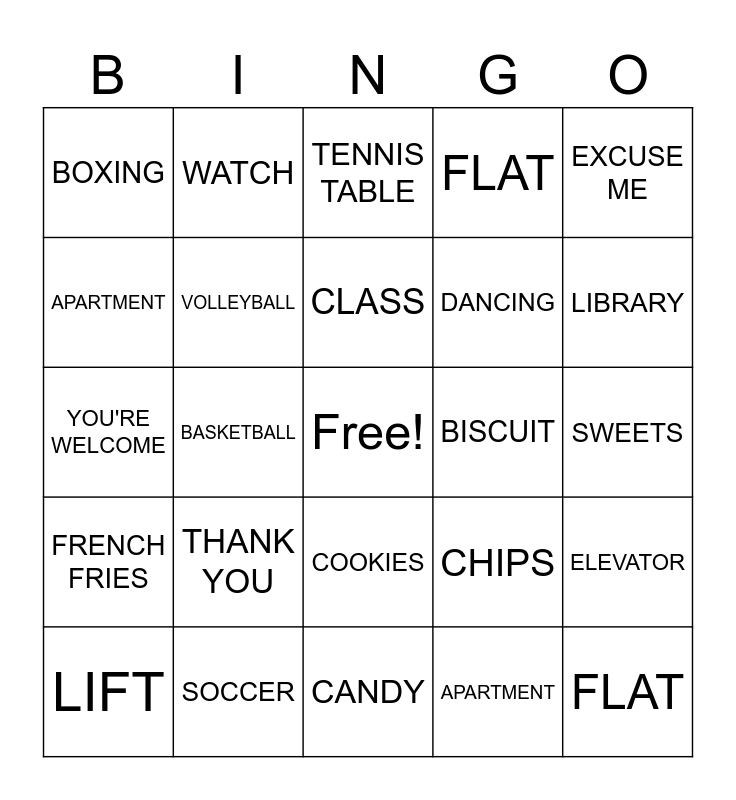 This bingo card has a free space and 30 words: SOCCER, FOOTBALL, BASKETBALL, ICE HOCKEY, BOXING, TENNIS TABLE, VOLLEYBALL, COOKIES, BISCUIT, CANDY, SWEETS, FLAT, APARTMENT, DRUGSTORE, LIBRARY, SUPERMARKET, CHIPS, FRENCH FRIES, THANK YOU, EXCUSE ME, YOU'RE WELCOME, PLAY, WATCH, DANCING, APARTMENT, FLAT, ELEVATOR, LIFT, CLASS and CLASSROOM.
