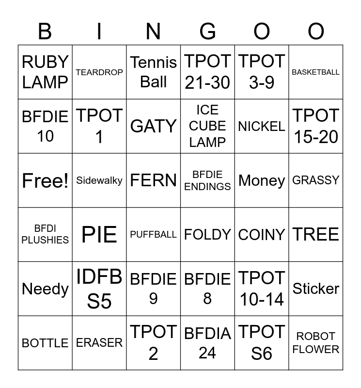 This bingo card has 36 words: BFDIE 8, BFDIE 9, BFDIA 24, BFDIE 10, BFDI PLUSHIES, BFDIE ENDINGS, TPOT 1, TPOT 2, TPOT 3-9, TPOT 10-14, TPOT 15-20, TPOT 21-30, Sticker, Sidewalky, ICE CUBE LAMP, RUBY LAMP, Needy, Money, Free!, Tennis Ball, FERN, PIE, FOLDY, PUFFBALL, COINY, TEARDROP, NICKEL, ERASER, GATY, BASKETBALL, ROBOT FLOWER, BOTTLE, TREE, GRASSY, IDFB S5 and TPOT S6.