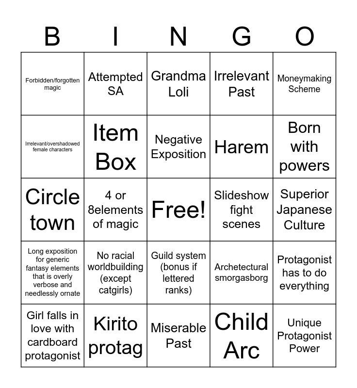 This bingo card has a free space and 34 words: Child Gifting, Child Arc, Game menu, Slavery, Long exposition for generic fantasy elements that is overly verbose and needlessly ornate, Item Box, Moneymaking Scheme, Girl falls in love with cardboard protagonist, Attempted SA, Revenge Fantasy, Negative Exposition, Grandma Loli, Divine Goddess, Demon King (bonus if 4 generals), Slideshow fight scenes, Born with powers, Kirito protag, Circle town, No racial worldbuilding (except catgirls), Archetectural smorgasborg, Guild system (bonus if lettered ranks), Appraisal or support skills, Forbidden/forgotten magic, Superior Japanese Culture, Miserable Past, Unique Protagonist Power, Irrelevant Past, Protagonist Handed Everything, Harem, Irrelevant/overshadowed female characters, Payoff without setup, 4 or 8elements of magic, Protagonist has to do everything and Wardrobe malfunction.