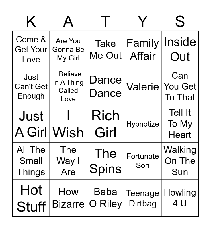 This bingo card has 32 words: Teenage Dirtbag, Buddy Holly, I Wish, My Own Worst Enemy, All The Small Things, I Believe In A Thing Called Love, Inside Out, Walking On The Sun, Are You Gonna Be My Girl, Howling 4 U, Dance Dance, Take Me Out, Can I Kick It?, Where Is My Mind?, Hypnotize, Gimmie!Gimmie!, Hot Stuff, Just A Girl, The Spins, The Way I Are, Fortunate Son, Crocodile Rock, Tell It To My Heart, How Bizarre, Rich Girl, Family Affair, Valerie, Just Can't Get Enough, Come & Get Your Love, Baba O Riley, Boogie Shoes and Can You Get To That.