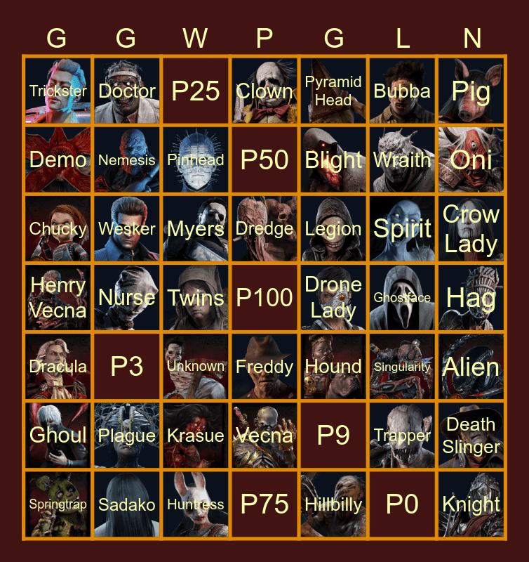 This bingo card has 42 images and 49 words: Trapper, Wraith, Hillbilly, Nurse, Myers, Hag, Doctor, Huntress, Bubba, Freddy, Pig, Clown, Spirit, Legion, Plague, Ghostface, Demo, Oni, Death Slinger, Pyramid Head, Blight, Twins, Trickster, Nemesis, Springtrap, Pinhead, Crow Lady, Sadako, Dredge, Wesker, Knight, Drone Lady, Ghoul, Krasue, Henry Vecna, Hound, Singularity, Alien, Chucky, Unknown, Vecna, Dracula, P100, P75, P50, P25, P9, P3 and P0.