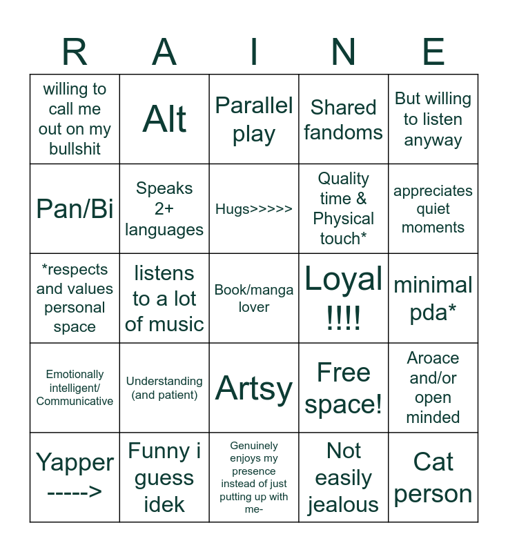 This bingo card has 25 words: Understanding (and patient), Genuinely enjoys my presence instead of just putting up with me-, Hugs>>>>>, Yapper ----->, But willing to listen anyway, willing to call me out on my bullshit, Pan/Bi, Alt, Loyal !!!!, Artsy, Quality time & Physical touch*, *respects and values personal space, Free space!, Aroace and/or open minded, Speaks 2+ languages, Cat person, minimal pda*, Parallel play, appreciates quiet moments, listens to a lot of music, Book/manga lover, Funny i guess idek, Emotionally intelligent/ Communicative, Shared fandoms and Not easily jealous.