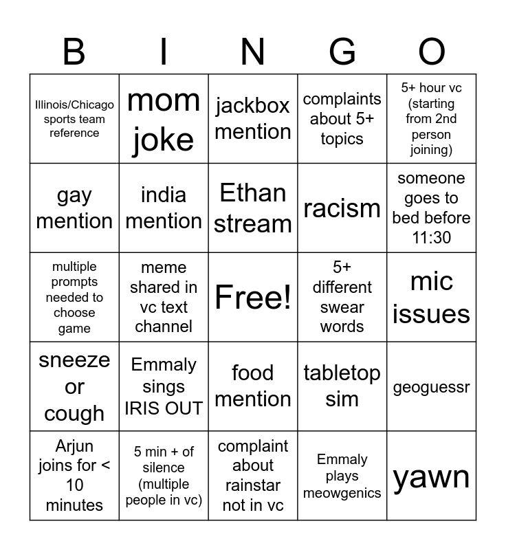 This bingo card has a free space and 24 words: Emmaly sings IRIS OUT, 5 min + of silence (multiple people in vc), Ethan stream, Arjun joins for < 10 minutes, 5+ hour vc (starting from 2nd person joining), Illinois/Chicago sports team reference, gay mention, mom joke, 5+ different swear words, food mention, racism, multiple prompts needed to choose game, tabletop sim, geoguessr, india mention, Emmaly plays meowgenics, mic issues, jackbox mention, someone goes to bed before 11:30, meme shared in vc text channel, yawn, sneeze or cough, complaints about 5+ topics and complaint about rainstar not in vc.