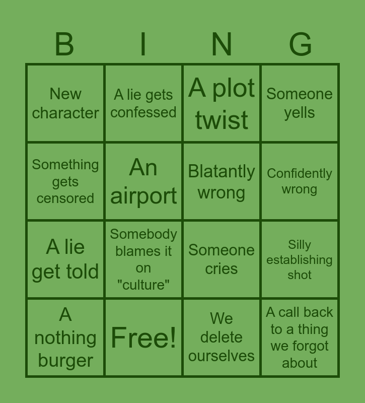 This bingo card has 16 words: Free!, Silly establishing shot, A plot twist, New character, A lie get told, A lie gets confessed, Someone cries, We delete ourselves, Something gets censored, An airport, A nothing burger, Someone yells, Somebody blames it on "culture", Confidently wrong, Blatantly wrong and A call back to a thing we forgot about.
