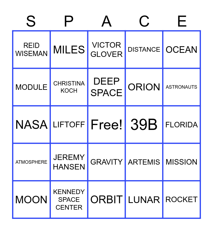 This bingo card has a free space and 29 words: MOON, EARTH, LIFTOFF, TELEMETRY, REID WISEMAN, VICTOR GLOVER, CHRISTINA KOCH, JEREMY HANSEN, 39B, KENNEDY SPACE CENTER, FLORIDA, ROCKET, ORBIT, LUNAR, ASTRONAUTS, FIGURE EIGHT, GRAVITY, ATMOSPHERE, OCEAN, NASA, ARTEMIS, APOLLO, ORION, MODULE, DISTANCE, MILES, MISSION, DEEP SPACE and LAUNCH.