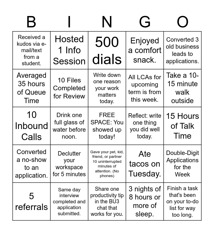 This bingo card has a free space and 24 words: Declutter your workspace for 5 minutes, Same day interview completed and application submitted., Write down one reason your work matters today., 5 referrals, Converted 3 old business leads to applications., Received a kudos via e-mail/text from a student., Averaged 35 hours of Queue Time, Hosted 1 Info Session, Reflect: write one thing you did well today., Gave your pet, kid, friend, or partner 10 uninterrupted minutes of attention. (No phones), All LCAs for upcoming term is from this week., 10 Inbound Calls, Ate tacos on Tuesday., Double-Digit Applications for the Week, 10 Files Completed for Review, 3 nights of 8 hours or more of sleep., 15 Hours of Talk Time, 500 dials, Take a 10-15 minute walk outside, Drink one full glass of water before noon., Finish a task that's been on your to-do list for way too long., Converted a no-show to an application., Enjoyed a comfort snack. and Share one productivity tip in the BU3 chat that works for you..