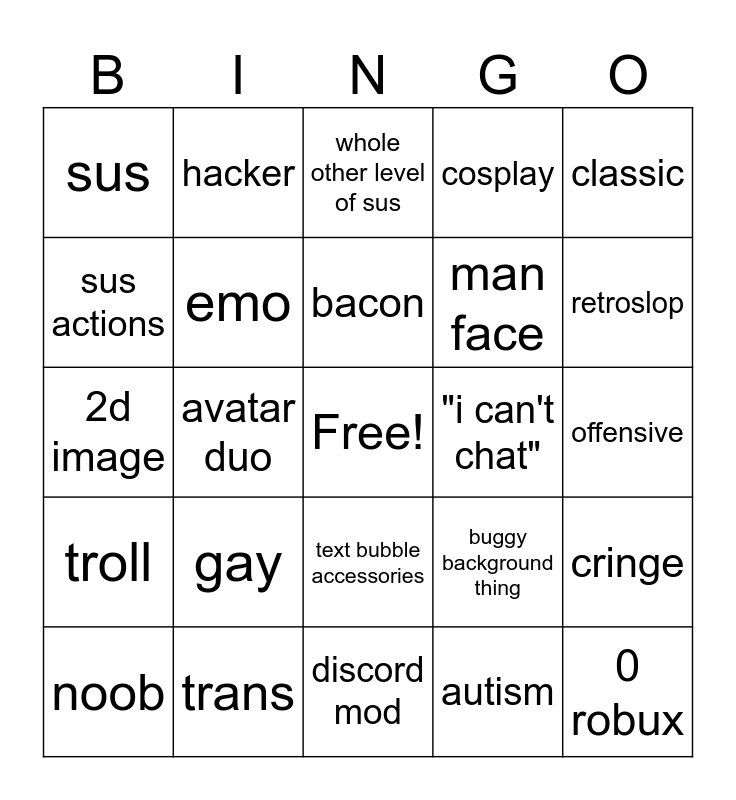 This bingo card has a free space and 24 words: gay, trans, bacon, noob, classic, sus, sus actions, hacker, "i can't chat", text bubble accessories, man face, 2d image, buggy background thing, cringe, emo, autism, offensive, whole other level of sus, retroslop, avatar duo, 0 robux, troll, cosplay and discord mod.