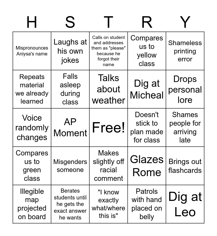 This bingo card has a free space and 64 words: "Talk to the class, not me", Talks about phones, Talks about building, Brings out flashcards, Calls kid by last name, Mentions importance of last names, Laughs at his own jokes, "Good job"/"Very good"/"Thank you", Talks about weather, Mentions his family, Makes slightly off racial comment, Objectifies women, Shames people for arriving late, Shameless printing error, Realizes he doesn't like his slides ("I don't know why this is here"), Repeats material we already learned, AP Moment, Mispronounces Aniysa's name, Wears wacky outfit, Dig at Micheal, Misgenders someone, Compares us to green class, Compares us to yellow class, "If you know what I mean", Tells us to quiet down, Perfect attendance, Dig at Shaan, Undecipherable sound, Talks about his college class, Has tech issues, Ms. Brinley walks in, Puts naked people on board, Cold calls a student he forgot existed, Mentions our stock, Drops personal lore, Illegible map projected on board, Applause on slideshow, Patrols with hand placed on belly, Plays classical music during work time, Falls asleep during class, Voice randomly changes, Doesn't stick to plan made for class, Pulls out laser pointer, "I love this picture", Sarcasm so bad you actually laugh, Dig at Leo, Berates students until he gets the exact answer he wants, Glazes Christianity, Glazes Rome, "Yep yep yep", Mentions glare, Mentions admin, "I know exactly what/where this is", Triple combo when called on (yes, please, I'm sorry, very good, thank you), Calls on someone mistaking them raising their hand, Disses Ms. Schultz, Calls on student and addresses them as "please" because he forgot their name, "You should know this"/"You should be taking notes", Etymology/linguistics lesson midway, Drops political lore, Mentions Ms. Tyson/Ms. O'Neil, Spreads hands out like preacher while listing, Triple combo of rhetorical questions and Corrects someone who's obviously more of an expert than him.