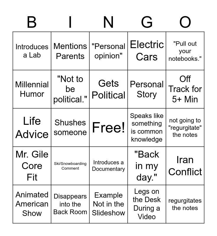 This bingo card has a free space and 24 words: Ski/Snowboarding Comment, Disappears into the Back Room, Gets Political, Animated American Show, "Pull out your notebooks.", Introduces a Lab, Millennial Humor, Mentions Parents, Speaks like something is common knowledge, Introduces a Documentary, Personal Story, Life Advice, "Back in my day.", Iran Conflict, "Not to be political.", Legs on the Desk During a Video, not going to "regurgitate" the notes, "Personal opinion", Off Track for 5+ Min, Shushes someone, regurgitates the notes, Mr. Gile Core Fit, Electric Cars and Example Not in the Slideshow.