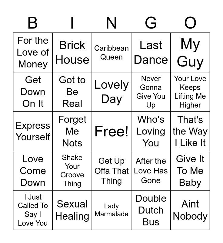 This bingo card has a free space and 24 words: Shake Your Groove Thing, Sexual Healing, Lovely Day, I Just Called To Say I Love You, My Guy, For the Love of Money, Get Down On It, Brick House, Who's Loving You, Get Up Offa That Thing, Never Gonna Give You Up, Express Yourself, After the Love Has Gone, Give It To Me Baby, Got to Be Real, Double Dutch Bus, That's the Way I Like It, Caribbean Queen, Your Love Keeps Lifting Me Higher, Forget Me Nots, Aint Nobody, Love Come Down, Last Dance and Lady Marmalade.