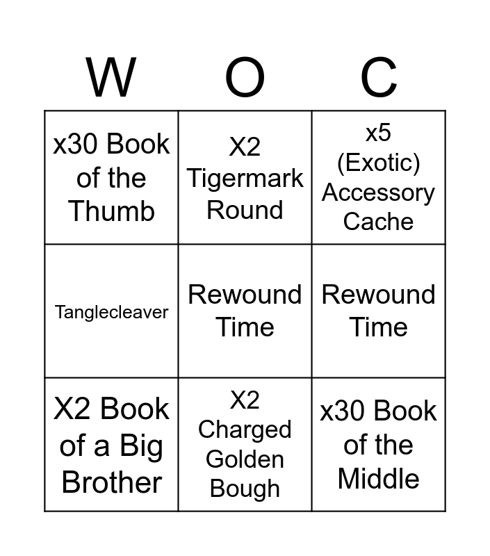 This bingo card has a free space and 10 words: X2 Charged Golden Bough, x5 (Exotic) Accessory Cache, x30 Book of the Thumb, x30 Book of the Middle, Tanglecleaver, X2 Book of a Big Brother, X2 Tigermark Round, x10 Envy Vestige Cache, Rewound Time and Tanglecleaver.