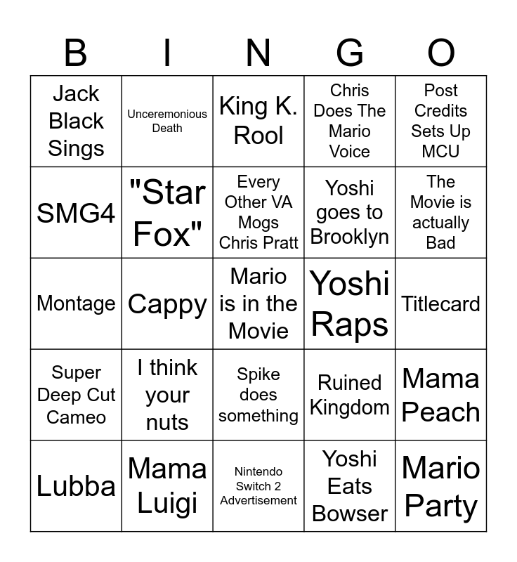 This bingo card has a free space and 24 words: I think your nuts, Mama Luigi, Every Other VA Mogs Chris Pratt, Lubba, Post Credits Sets Up MCU, Jack Black Sings, SMG4, Unceremonious Death, Yoshi Raps, Spike does something, Yoshi goes to Brooklyn, Montage, Ruined Kingdom, Mama Peach, "Star Fox", Yoshi Eats Bowser, Titlecard, King K. Rool, The Movie is actually Bad, Cappy, Mario Party, Super Deep Cut Cameo, Chris Does The Mario Voice and Nintendo Switch 2 Advertisement.