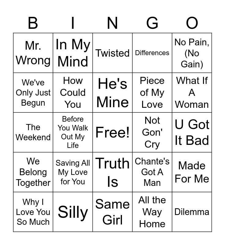 This bingo card has a free space and 24 words: Saving All My Love for You, Silly, He's Mine, Why I Love You So Much, No Pain, (No Gain), Mr. Wrong, We've Only Just Begun, In My Mind, Not Gon' Cry, Truth Is, Piece of My Love, The Weekend, Chante's Got A Man, Made For Me, How Could You, All the Way Home, U Got It Bad, Twisted, What If A Woman, Before You Walk Out My Life, Dilemma, We Belong Together, Differences and Same Girl.