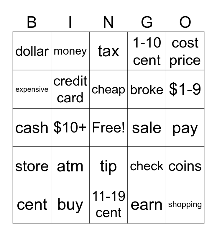 This bingo card has a free space and 24 words: atm, buy, cheap, cent, cost price, dollar, expensive, money, sale, tip, broke, cash, check, coins, credit card, earn, pay, tax, $1-9, $10+, shopping, store, 1-10 cent and 11-19 cent.