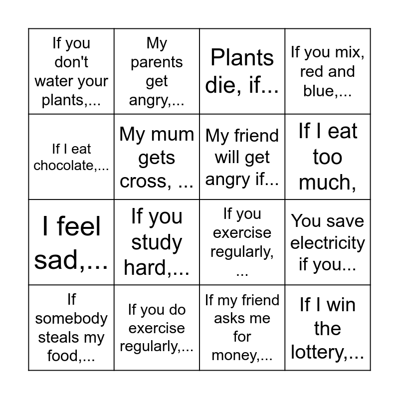 This bingo card has 28 words: If you leave butter in the sun ,..., If you leave ice outside,..., I feel sad,..., I get annoyed, if ..., My mum gets cross, ..., Plants die, if..., My parents get angry,..., If I win the lottery,..., If you do exercise regularly,..., If my phone stops working,..., If you exercise regularly, ..., If you mix, red and blue,..., If i don't feel very well,, If we finish our work,..., If you study hard,..., If you mix blue and yellow paint..., I will pass my exams if..., My friend will get angry if..., If I eat too much,, If it rains,..., If you don't water your plants,..., I will be happy if..., If somebody steals my food,..., You save electricity if you..., If my friend asks me for money,..., I will buy a car if..., If I eat chocolate,... and I won't be happy if....