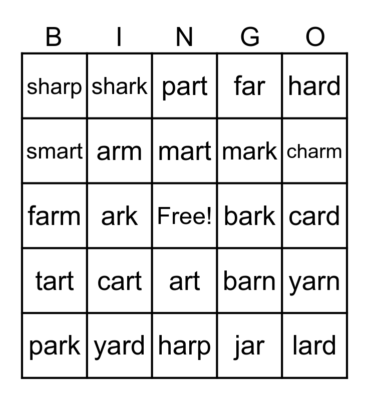 This bingo card has a free space and 24 words: cart, yard, mart, park, hard, sharp, smart, shark, bark, art, mark, farm, barn, yarn, arm, jar, card, part, charm, ark, lard, tart, far and harp.