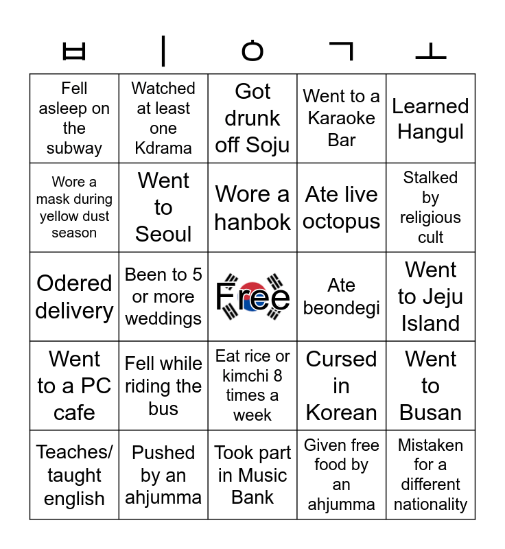 This bingo card has a free space and 24 words: Fell while riding the bus, Pushed by an ahjumma, Wore a hanbok, Teaches/ taught english, Learned Hangul, Fell asleep on the subway, Wore a mask during yellow dust season, Watched at least one Kdrama, Ate beondegi, Eat rice or kimchi 8 times a week, Ate live octopus, Odered delivery, Cursed in Korean, Went to Busan, Went to Seoul, Given free food by an ahjumma, Went to Jeju Island, Got drunk off Soju, Stalked by religious cult, Been to 5 or more weddings, Mistaken for a different nationality, Went to a PC cafe, Went to a Karaoke Bar and Took part in Music Bank.