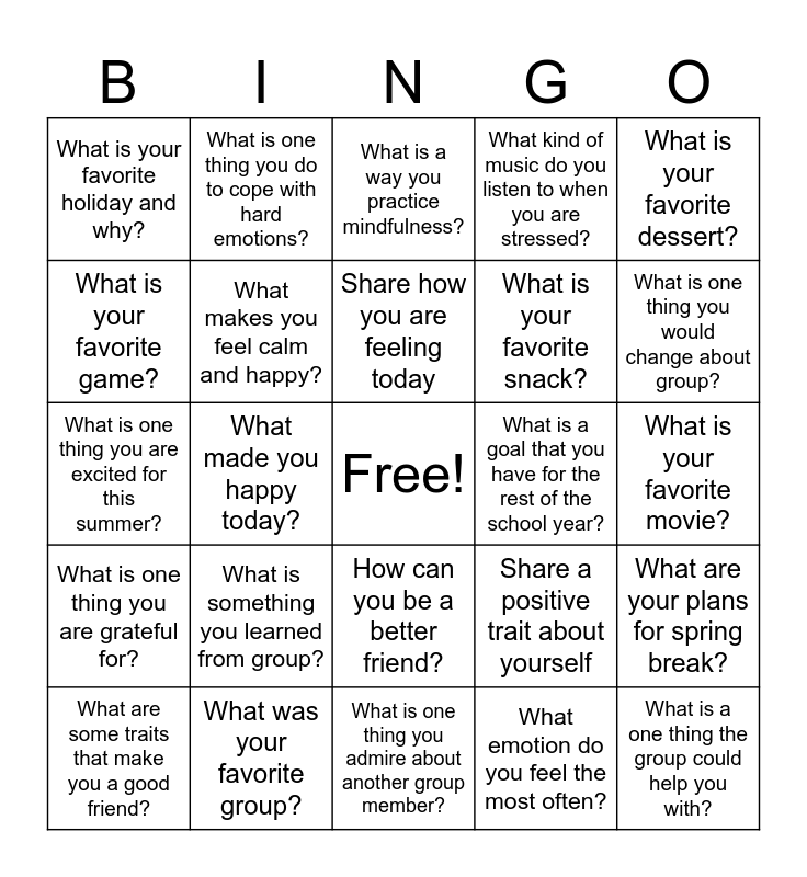 This bingo card has a free space and 24 words: What are some traits that make you a good friend?, What is something you learned from group?, Share how you are feeling today, What emotion do you feel the most often?, What is your favorite dessert?, What is your favorite holiday and why?, What is one thing you do to cope with hard emotions?, What is a way you practice mindfulness?, What is a goal that you have for the rest of the school year?, What is your favorite movie?, What is one thing you are excited for this summer?, What makes you feel calm and happy?, Share a positive trait about yourself, What are your plans for spring break?, What is your favorite game?, What was your favorite group?, What is one thing you admire about another group member?, What kind of music do you listen to when you are stressed?, What is one thing you would change about group?, What is one thing you are grateful for?, What made you happy today?, How can you be a better friend?, What is your favorite snack? and What is a one thing the group could help you with?.
