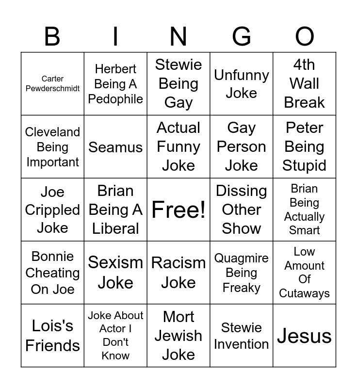 This bingo card has a free space and 24 words: Lois's Friends, Sexism Joke, Actual Funny Joke, Stewie Invention, 4th Wall Break, Carter Pewderschmidt, Herbert Being A Pedophile, Stewie Being Gay, Dissing Other Show, Brian Being Actually Smart, Joe Crippled Joke, Seamus, Quagmire Being Freaky, Low Amount Of Cutaways, Cleveland Being Important, Joke About Actor I Don't Know, Mort Jewish Joke, Unfunny Joke, Peter Being Stupid, Bonnie Cheating On Joe, Brian Being A Liberal, Racism Joke, Gay Person Joke and Jesus.
